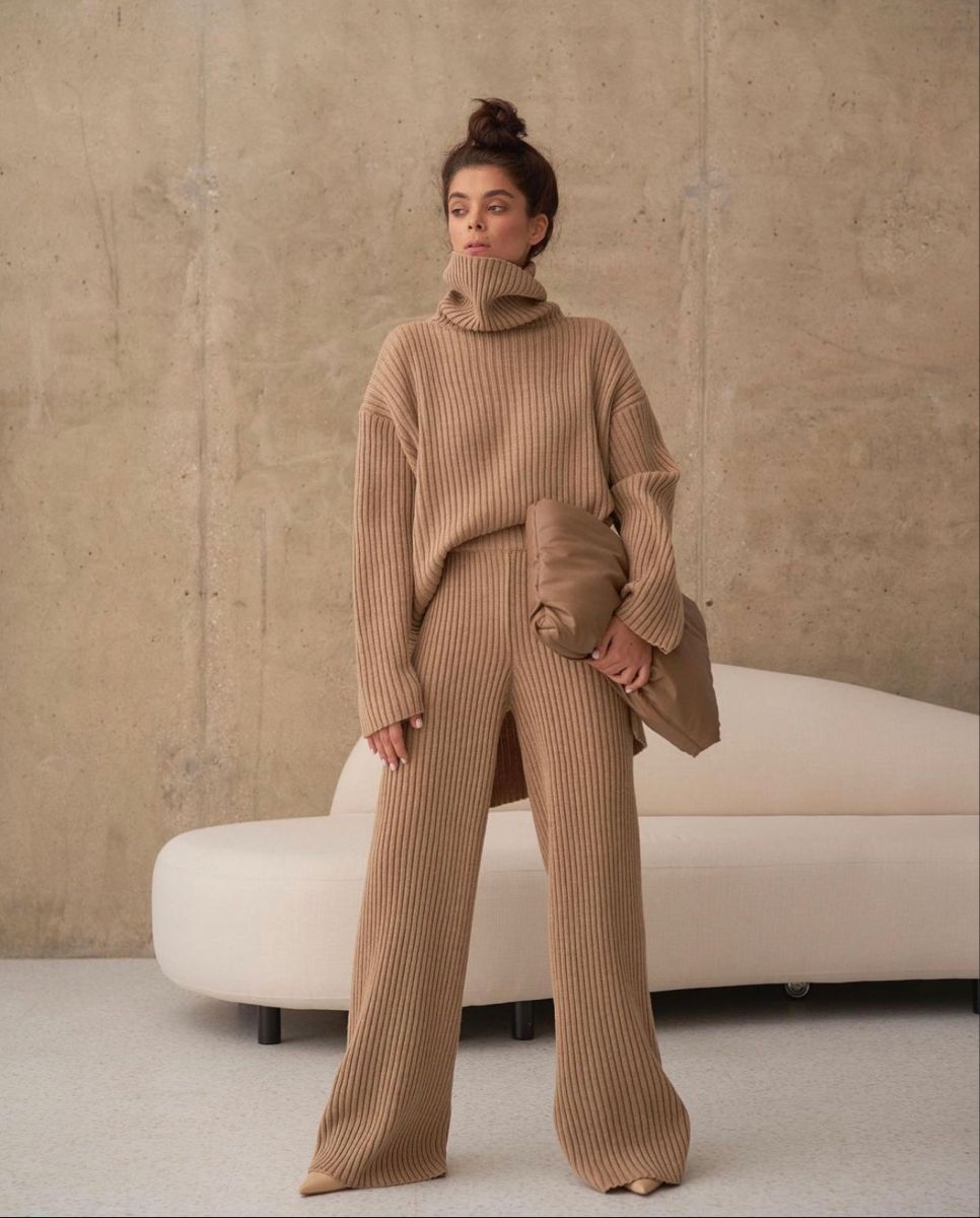 Трикотажні костюми зовсім не обов'язково повинні складатися з штанів та джемпера. У нових колекціях дизайнери пропонують варіанти з подовженими светрами із високим горлом. Таку теплу та затишну річ ви не захочете знімати всю зиму. Орім того, ви зможете обрати ширину та довжину светра та штанів.