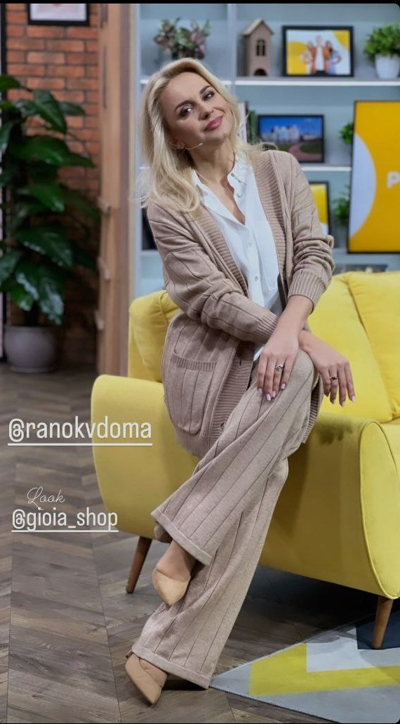 Трендовий в'язаний костюм Ребрик поєднала з білою сорочкою та туфлями-човниками, які за кольоровою гамою чудово гармонують із вбранням.