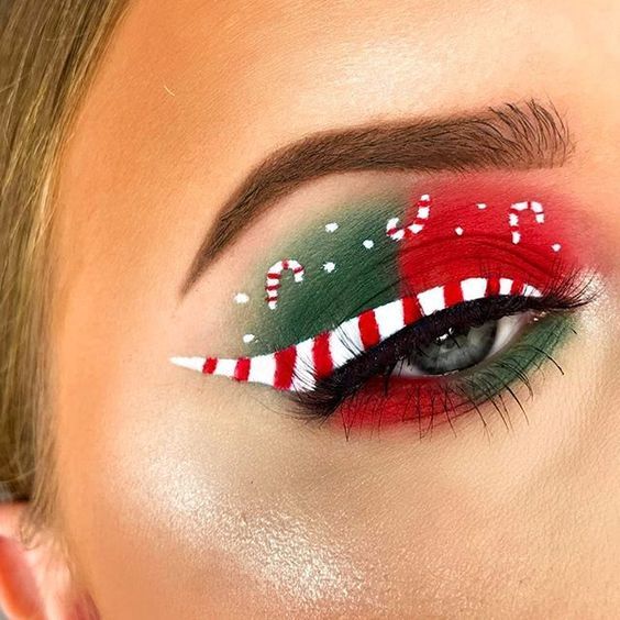 Готові на цьому новорічному корпоративі здивувати навіть саму себе? Тоді вибирайте наступний варіант макіяжу. Для нього знадобляться кольори, які символізують прихід Різдва та дива – білий, червоний, зелений. На повіки нанесіть червоний та зелений, а для стрілки знадобляться червоний та білий кольори.