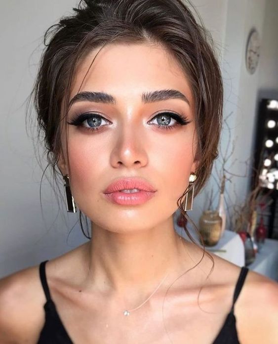 Ця ідея макіяжу сподобається дівчатам, які люблять виглядати максимально природно навіть із косметикою на обличчі. Нанесіть на область між бровою і повікою світло-бежеві тіні, вилиці виділіть хайлайтером. Завершіть макіяж насиченим відтінком матової помади.