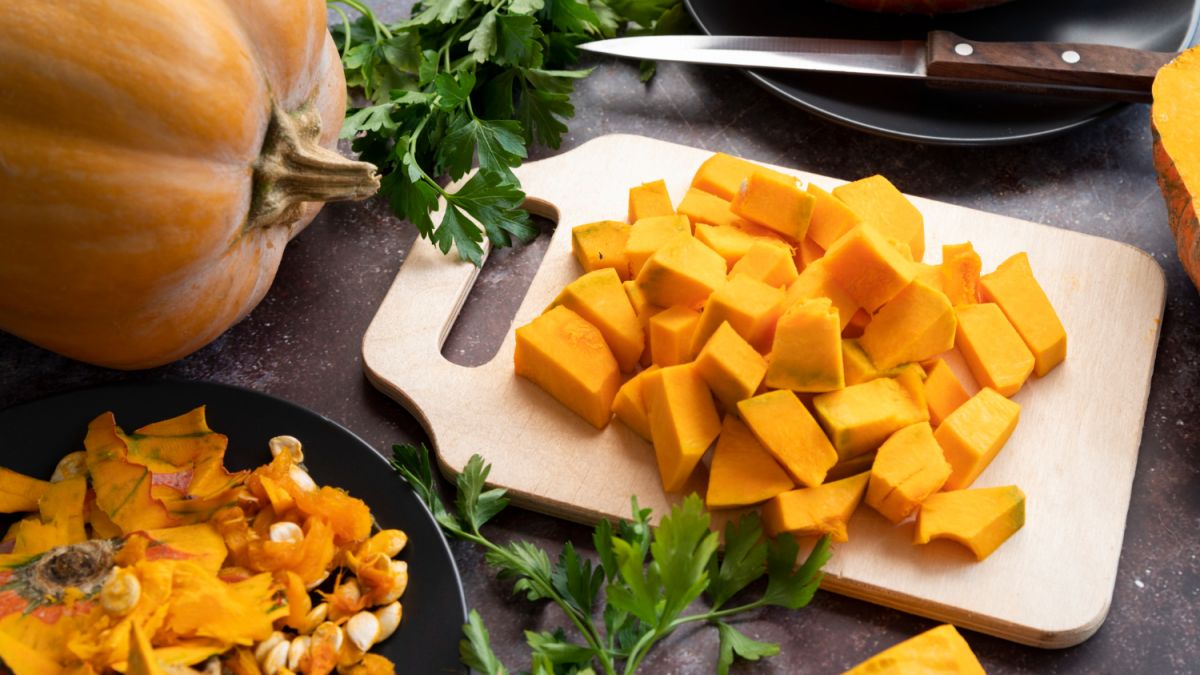 Вибираємо ту частину гарбуза, де більше м'якоті, очищаємо від шкірки і нарізаємо невеликими кубиками.