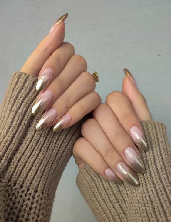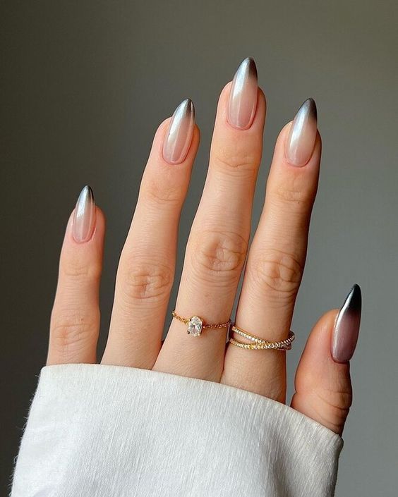 Також у тренді перламутрові нігті, тому дизайн омбре можна доповнити таким ефектом. Для того щоб зробити такий манікюр, нігті покриваємо перламутровим лаком або використовуємо спеціальну втирку, яка створює сяючий ефект.