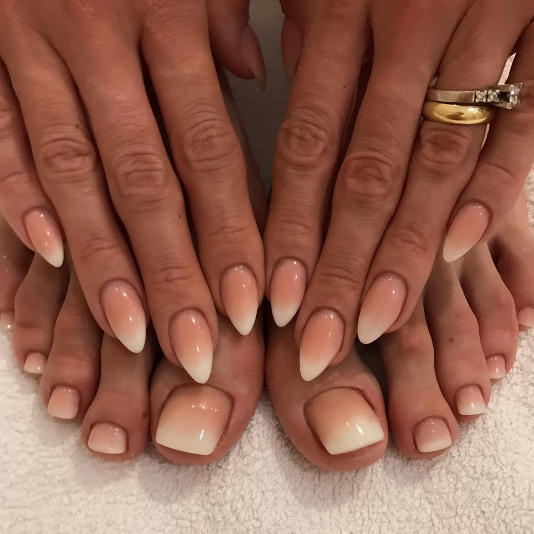 Якщо ви любите охайний дизайн без зайвих акцентів, зробіть класичне омбре. Для такого покриття характерне використання нюдового бежевого або рожевого та білого. Ця комбінація не виходить із моди вже кілька сезонів поспіль, адже є вдалою альтернативою класичному французькому манікюру.