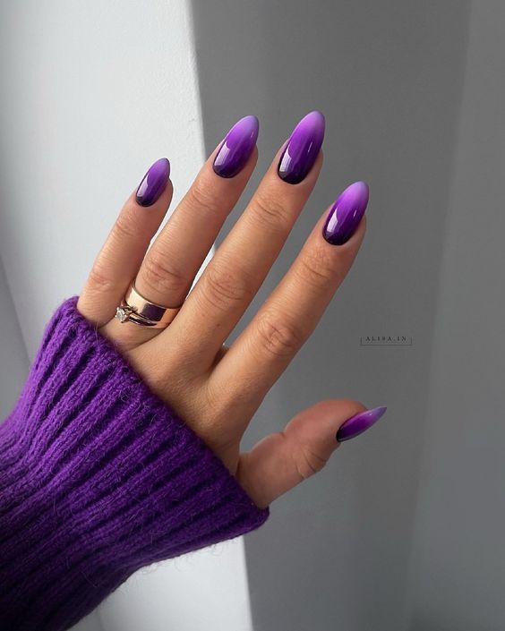 Як відомо, у трендах 2024 року насичені фіолетові відтінки. Тому з цим кольором теж можна зробити стильний манікюр омбре і доповнити його блискітками.