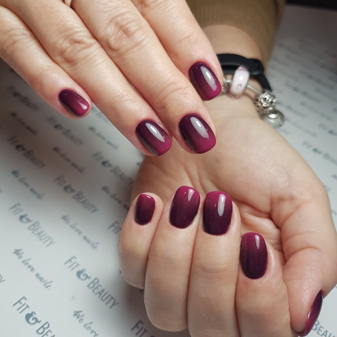 А на коротких нігтях гарно виглядатиме бордовий манікюр із дизайном омбре.