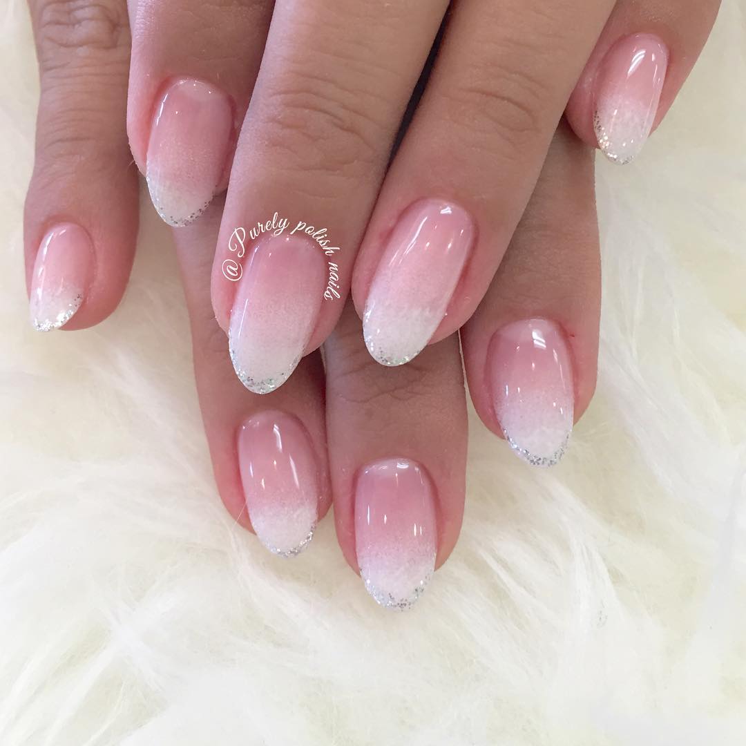 Ще один варіант – поєднання омбре та мікрофренча. Це може бути перехід від рожевого до білого відтінку, а кінчик додатково прикрашаємо сріблястим гель-лаком з блискітками.