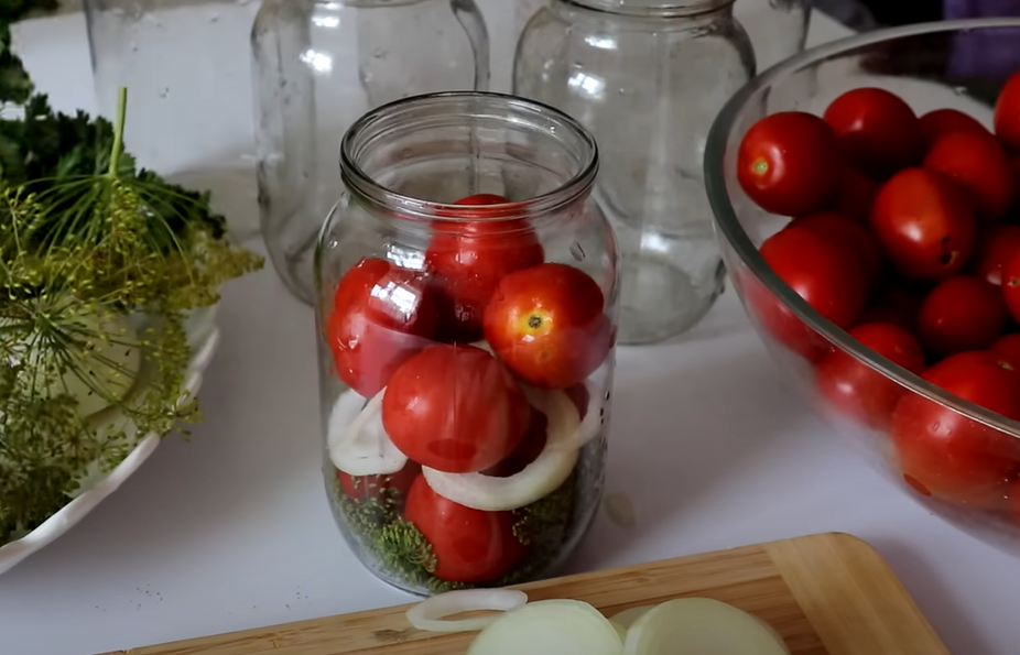 Помідори і спеції викладаємо в стерилізовані банки, куди на дно кладемо кріп, лаврові листи й горошини перцю. Кільця цибулі викладаємо зверху на помідори і перекладаємо шарами, додаємо гілочку петрушки.