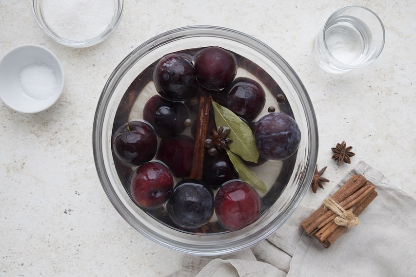 Стиглі сливи добре промити у проточній воді. У каструлі до води додати цукор, оцет, гвоздику, лавровий лист, щіпку меленої кориці та лимонний сік. Все це перемішати та довести до кипіння, прокип'ятити дві-три хвилини.