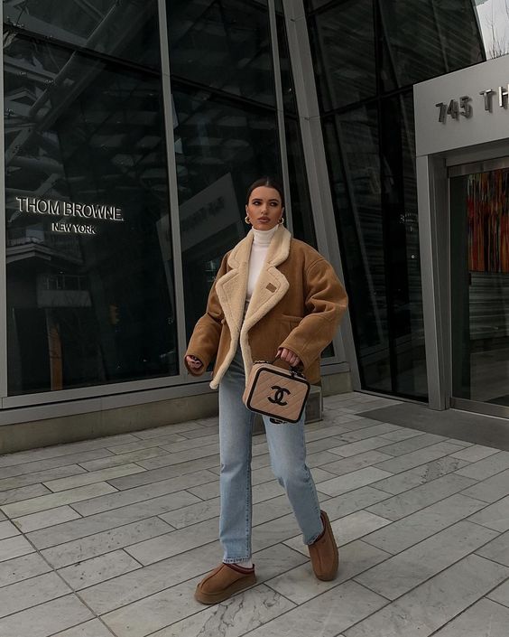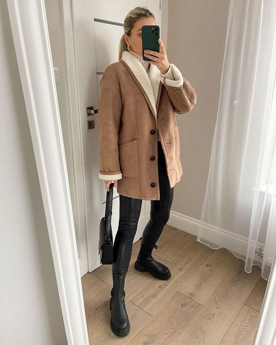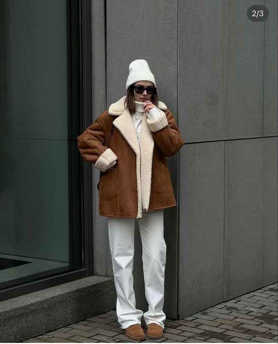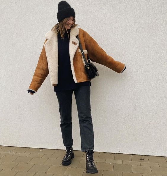 Зазначимо, що такий верхній одяг найкраще поєднується з джинсами та шкіряними брюками чи легінсами. А доповнять образ грубі черевики на тракторній підошві або трендові уггі в тон до дублянки, а також невелика сумка.