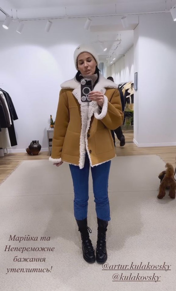 Так, днями в Instagram-stories вона продемонструвала образ зі світло-коричневою укороченою дублянкою з хутром контрастного кольору на комірі. Під неї Єфросиніна одягла сині джинси скінні та светр із високим горлом. Доповнили лук грубі черевики на шнурівці, а також в'язана біла шапка.