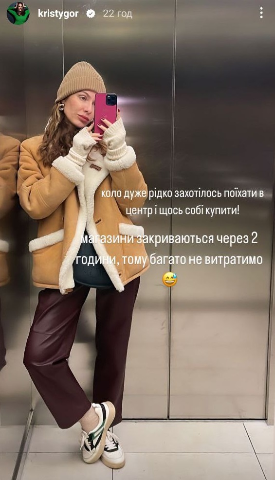 Схожу модель для повсякденного луку обрала колишня дружина телеведучого Володимира Остапчука Христина Горняк. Під бежево-коричневу дублянку вона одягла бордові шкіряні штани прямого крою, теплий светр та шапку. Доповнила обараз зручними кросівками та сумкою крос-боді.
