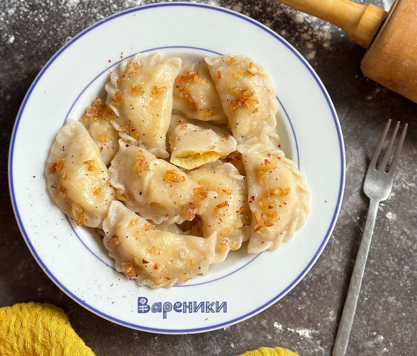 Готові вареники подаємо зі смаженою цибулею.