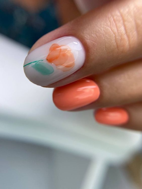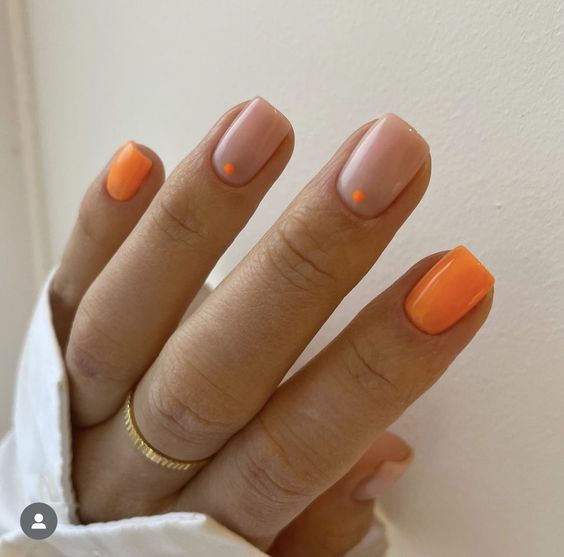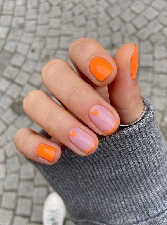 Також у тренді яскравий манікюр, наприклад, помаранчевий. На коротких нігтях гарно виглядатиме як однотонне покриття, так і з різними дизайнами. Наприклад, на декількох нігтях можна зробити френч із помаранчевим кінчиком або доповнити дизайн хвилястими лініями, наклейкою або малюнком сердечок.