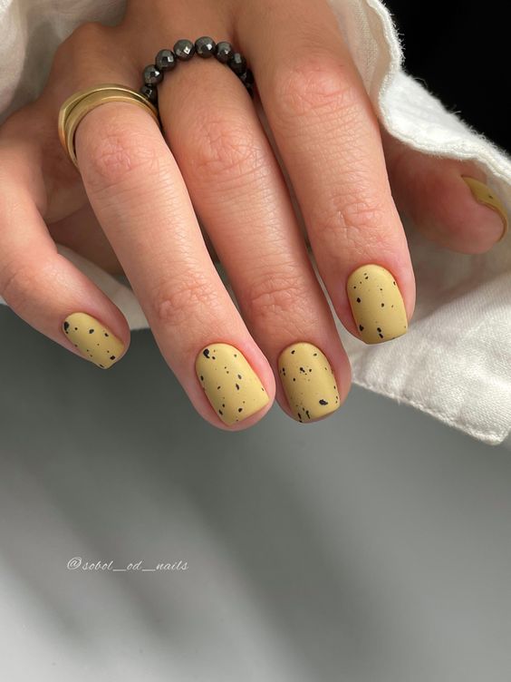 Ще один тренд – дизайн перепелине яйце. Як відомо, шкаралупа перепелиних яєць відрізняється оригінальним візерунком від природи, який можна зімітувати у манікюрі. Для цього покриваємо нігті одним або декількома відтінками, а поверх наносимо в хаотичному порядку безліч маленьких цяток і чорних крапок.