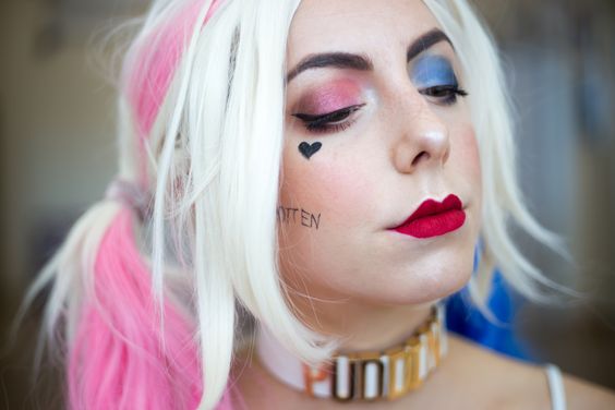 Ще одна смілива ідея - макіяж у стилі суперзлодійки з коміксів Харлі Квінн. Щоб зробити його, виділіть губи чорною або червоною помадою. На одному оці зробіть акценти рожевим, а на іншому - синім кольором. Також можна доповнити образ невеликими сердечками в області вилиць.