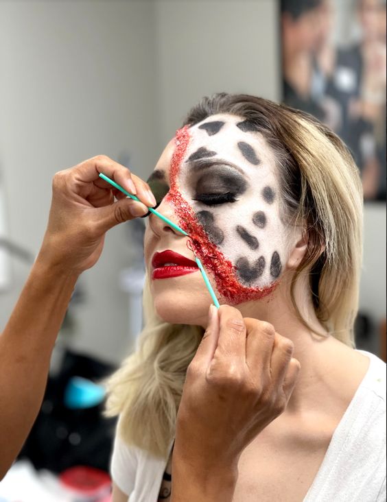 Також можна зробити нестандартний образ за мотивами фільму "101 далматинець". На одній половині обличчя зробити просто яскравий макіяж, а другу загримувати, імітуючи плями цієї породи собак. На шиї і зоні декольте також можна зробити такі плями.