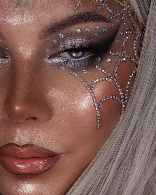 Ще один варіант макіяжу - з павуковими лапками. Для початку зробіть макіяж у стилі "смокі айс", а потім домалюйте лапки павука, які можна прикрасити стразами. Губи нафарбуйте червоною помадою і обведіть контур чорним олівцем.