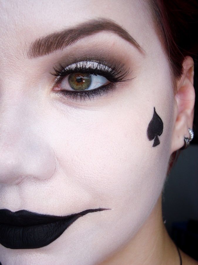 Також можна зробити стриманий, але стильний варіант у стилі пікової дами. Для цього досить вирівняти тон обличчя і намалювати знак, що позначає масть. Губи виділіть чорною помадою, а очі - накладними віями.