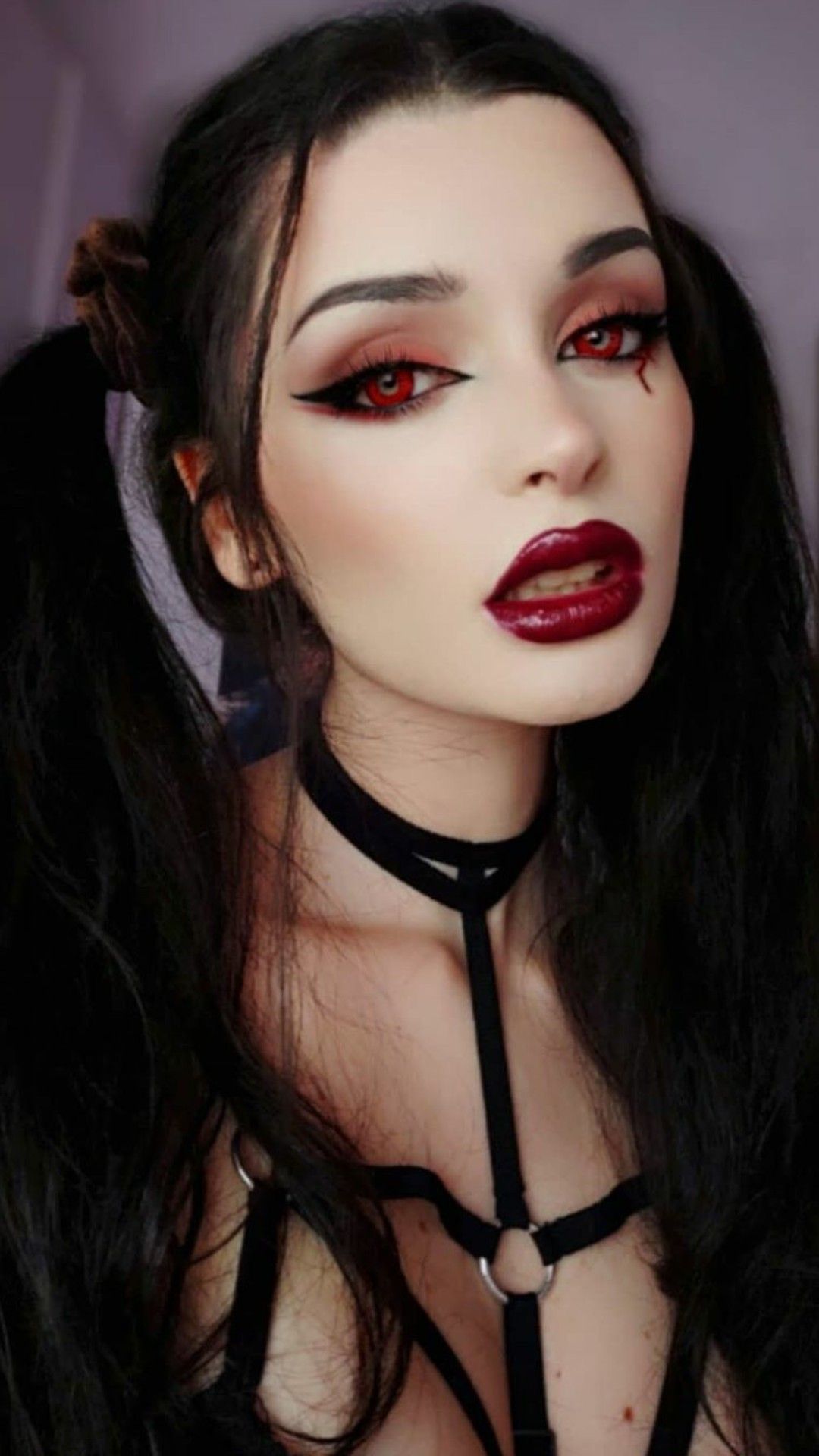Традиційним для Хелловіна також вважається образ вампіра. Щоб створити його, необхідно мінімум косметики: губи підкреслити червоною помадою, очі виділити чорними стрілками. Доповнити образ можна ефектними лінзами і накладними іклами.