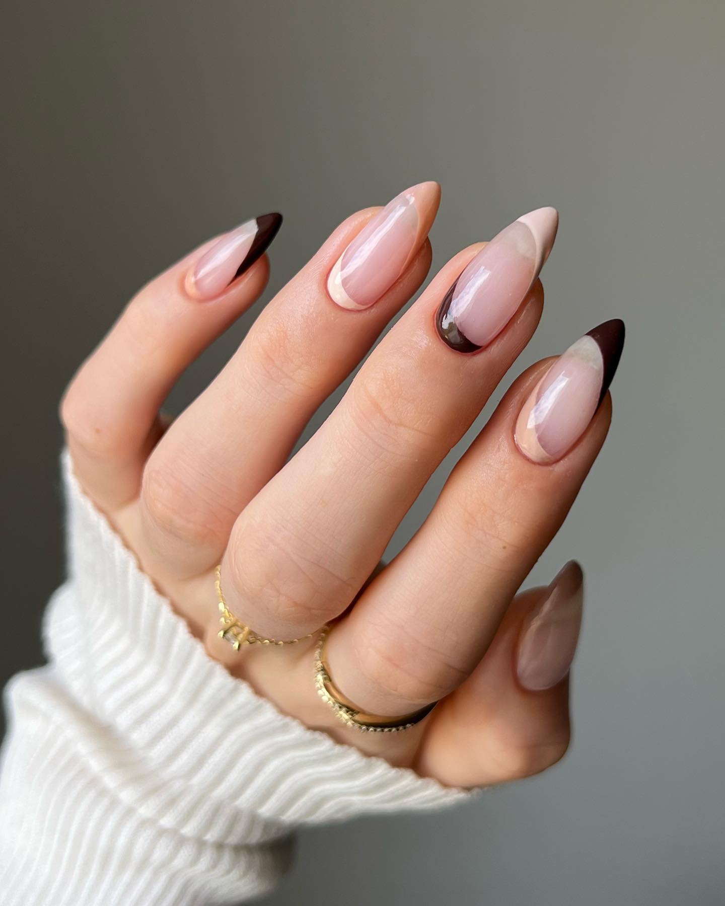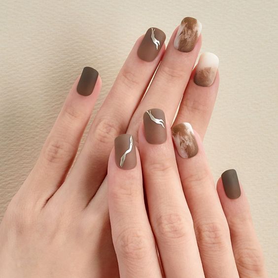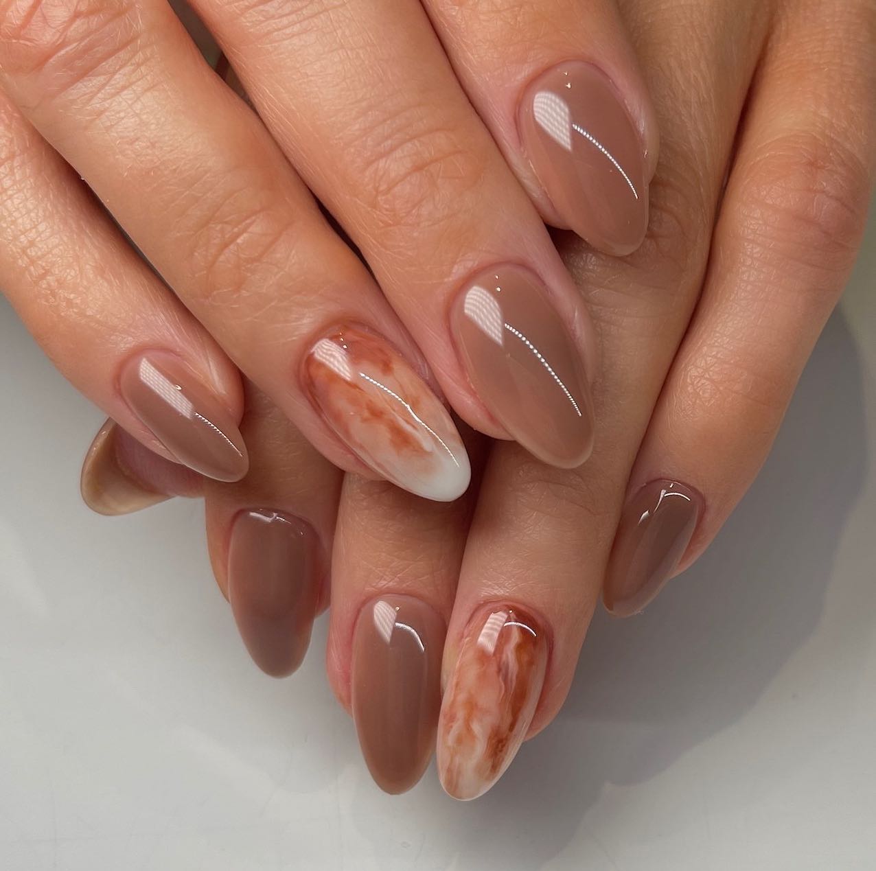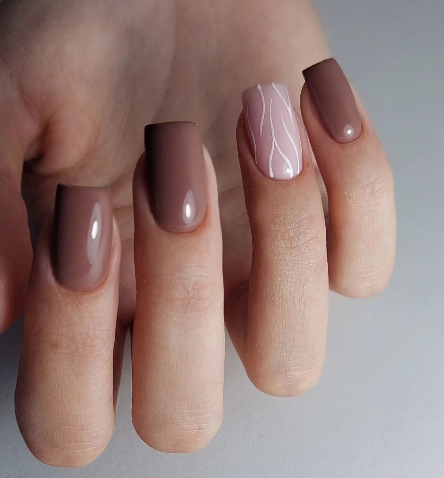 Манікюр лате виглядає вишукано та нейтрально, тому ідеально підходить для будь-яких випадків та образів. Крім того, коричневі та бежеві відтінки доповнюють кольори сезону, створюючи справжню осінню гармонію.