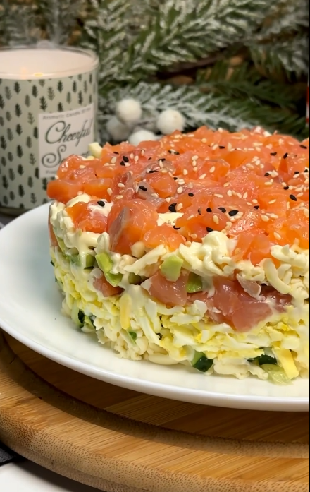 Другий шар – огірок, майонез. Третій – яйця, сіль, перець, майонез. Четвертий – червона риба. П'ятий – авокадо, сіль, перець, майонез. Шостий – плавлені сирки, майонез. Сьомий шар – сьомга (лосось).