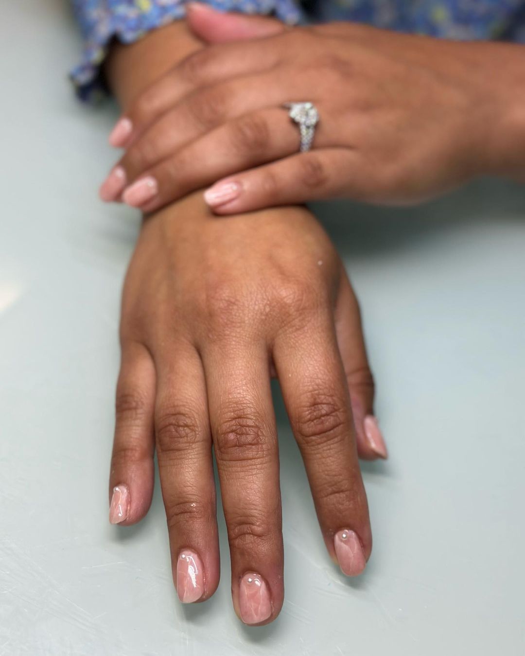 Манікюр, натхненний рожевим кварцом, все ще потрапляє в сферу нюдового стилю. Почніть з прозорої рожевої основи, а завершіть її надтонкими білими лініями, щоб імітувати унікальний вигляд каменю.