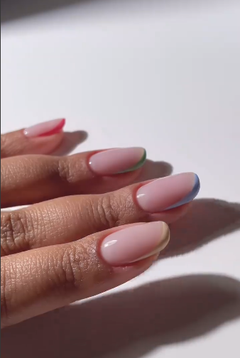 Хочете трохи кольору? Зробіть свій молочно-нюдовий манікюр асиметричними пастельними кінчиками. Це може бути найідеальніший весільний манікюр. Почніть з молочної основи, а потім додайте чітку білу лінію на верхню частину кожного нігтя, щоб створити красивий французький манікюр.