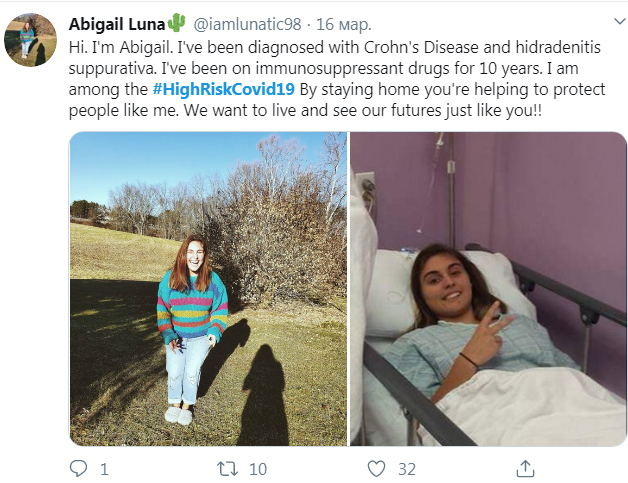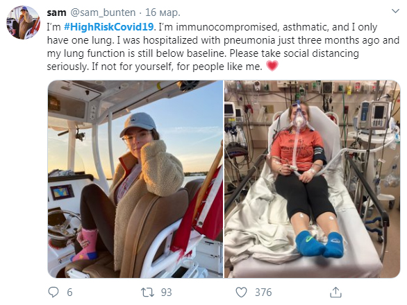"Я в групі ризику. У мене імунодефіцит, астма і тільки одна легеня. Мене забрали до лікарні з пневмонією три місяці тому, і робота моєї легені все ще нижче норми. Будь ласка, ставтеся до соціального дистанціювання серйозно. Якщо не заради себе, то заради таких людей, як я".