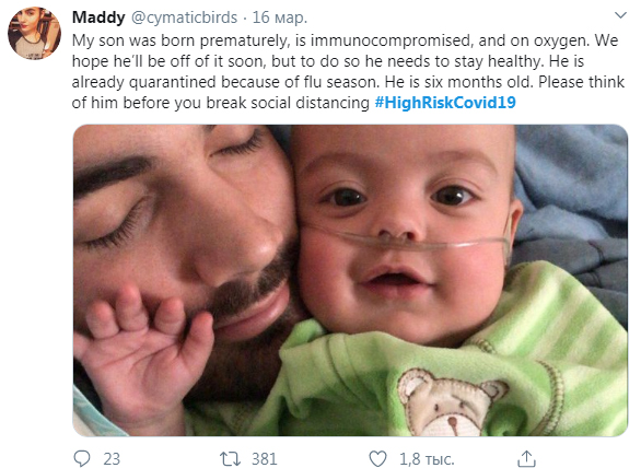 "Мій син народився раніше терміну, у нього імунодефіцит і йому потрібен додатковий кисень. Ми сподіваємося, що скоро він зможе справлятися без препаратів, але для цього йому необхідно залишатися здоровим. Він уже на карантині через сезон грипу. Йому 6 місяців. Будь ласка, подумайте про нього перед тим, як ви порушите соціальне дистанціювання".