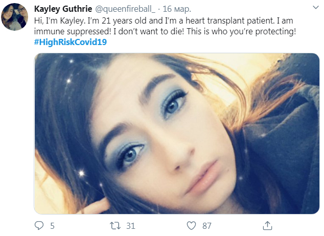 "Привіт, я Кейлі. Мені 21 рік і я пацієнт з пересадженим серцем. Я на імуносупресорах! Я не хочу вмирати! Ось, кого ви захищаєте!".