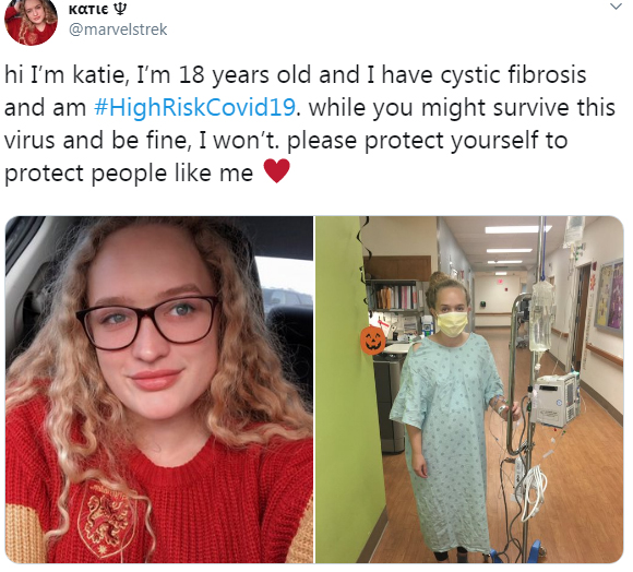 "Привіт! Я Кеті, мені 18 років, у мене кістозний фіброз і я в групі ризику. Якщо ви можете нормально перенести вірус, то я ні. Будь ласка, захистіть себе, щоб захистити таких людей, як я".