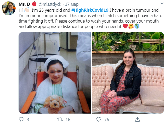 "Привіт. Мені 25 років і я в групі ризику. У мене пухлина мозку і імуннодефіціт. Це означає, якщо я підхоплю щось, мені буде дуже непросто з цим боротися. Будь ласка, продовжуйте мити руки, прикривати рот і дотримуватися необхідної дистанції заради людей, яким це потрібно".