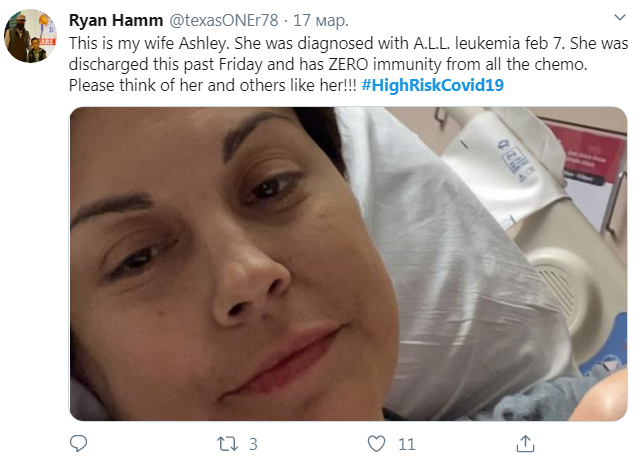 "Це моя дружина Ешлі. У неї діагностували лейкемію 7 лютого. Її виписали минулої п'ятниці і у неї нуль імунітету через хімію. Будь ласка, подумайте про неї та інших подібних людей".
