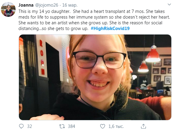 "Це моя 14-річна дочка. Їй пересадили серце в 7 місяців. Вона приймає препарати довічно, щоб підтримувати імунну систему і не дати організму відторгнути серце. Вона хоче стати художником, коли виросте. Вона є причиною для соціального дистанціювання. Щоб мати шанс вирости".