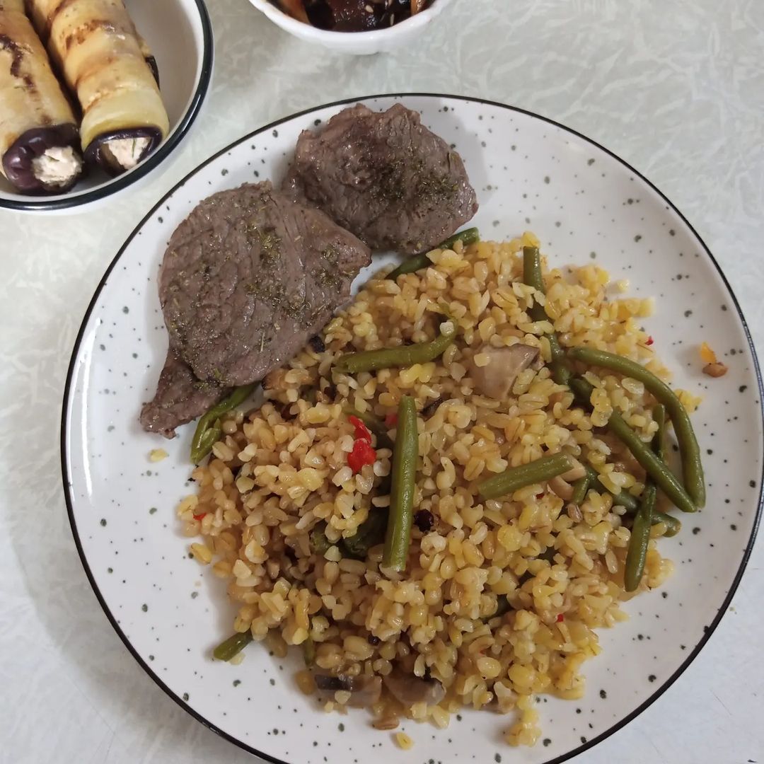 Подаємо смажений булгур з улюбленим салатом та м'ясною або рибною стравою.