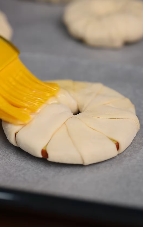 3. Загортаємо яблучні кільця у тісто, змащуємо жовтком, посипаємо цукром і корицею.
