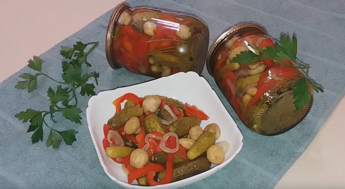 Інгредієнти (на 10 банок по 0,5 л): маленькі огірки (2 кг), маленькі печериці (750 г), болгарський перець (6-7 шт.), цибуля ріпчаста (400-500 г), вода (10 склянок) , сіль (1 склянка), кріп, петрушка, лавровий лист, перець чорний та духмяний горошок.