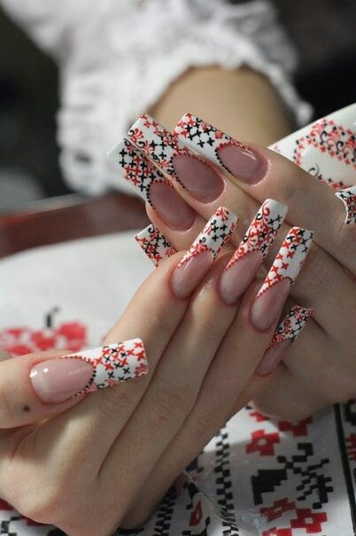 Манікюр з візерунком вишиванки не тільки розбавить повсякденні луки, але й надасть яскравого акценту образу у святковий день, якщо, наприклад, ви збираєтеся на весілля, ювілей чи хрестини.