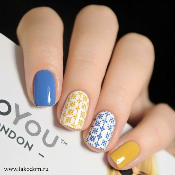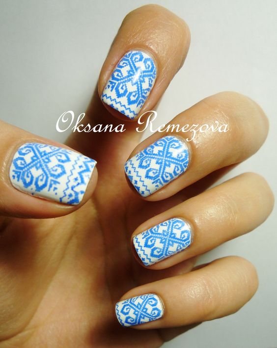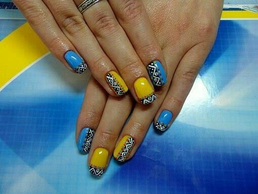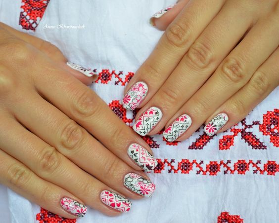 Основна кольорова гама класичної української вишиванки – чорні та червоні нитки на білому тлі. Однак за бажанням їх можна розбавити й іншими яскравими відтінками. Наприклад, можна зробити манікюр у синьо-жовтих тонах. Також такі дизайни можна розбавити квітами – символами України: маками, соняшниками, волошками.