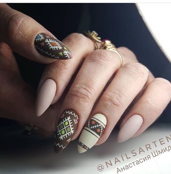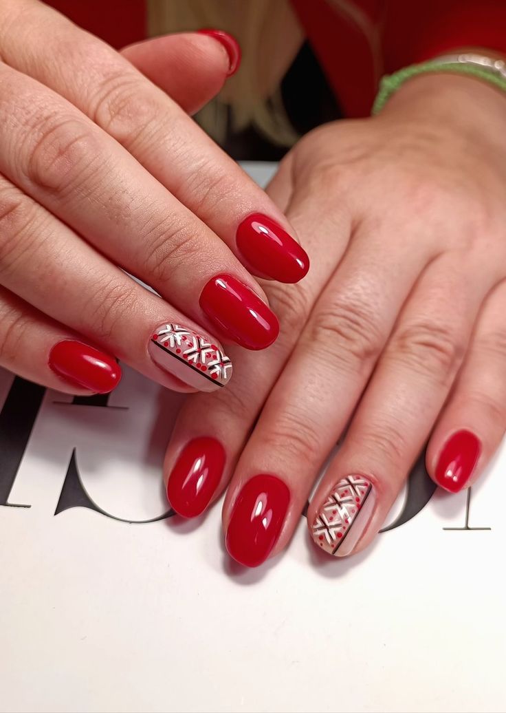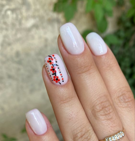 Для повсякденного носіння можна вибрати однотонний манікюр, а один або два нігті прикрасити візерунками у вигляді вишиванки.