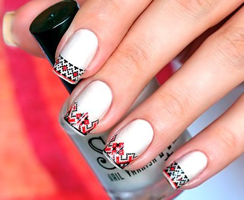 Також можна поекспериментувати і зробити незвичний французький манікюр і замість білого кінчика прикрасити нігті манікюром-вишиванкою.