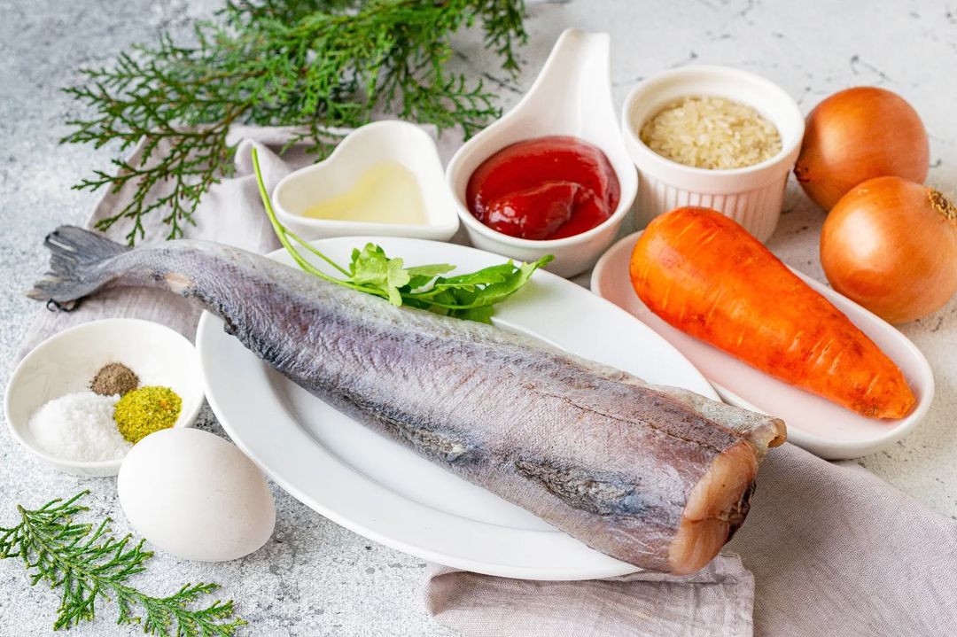 Інгредієнти: минтай – 500 г, рис – 50 г, куряче яйце – 1 шт., морква – 1 шт., цибуля ріпчаста – 2 шт., томатна паста – 75 г, рослинна олія – 50 мл, лавровий лист – 1 шт., запашний перець горошком - 2-3 шт., сіль та чорний мелений перець - за смаком, петрушка - 2-3 гілочки, вода - 300 мл.