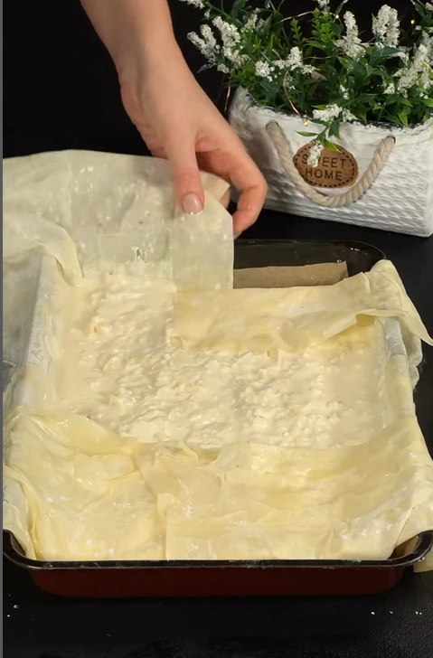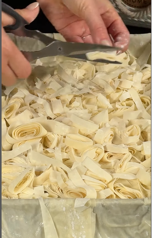 3. Два листи тіста філо скручуємо у трубочку і нарізаємо на смужки, які рівномірно розподіляємо у деку. Робимо те саме ще 4-6 листами. Розправляємо "стружку" з тіста філо і поливаємо все водою з олією.