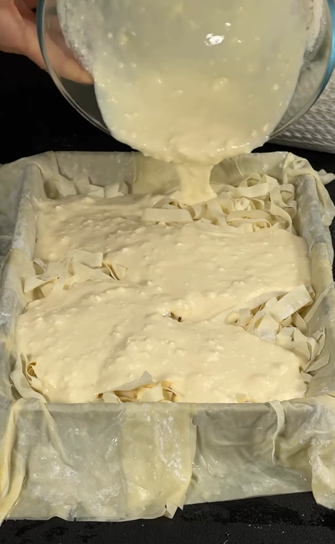 4. Для начинки 400 г сиру фета розминаємо виделкою, додаємо 2 яйця, 150 г йогурту або сметани, пів чайної ложки розпушувача, пів чайної ложки солі та 200 мл молока. Усе ретельно перемішуємо і виливаємо у форму.