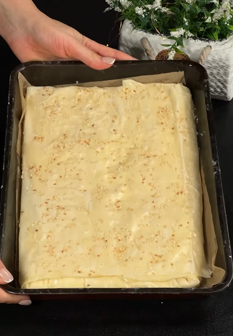 7. Наверх кладемо останній листок тіста філо, який також змащуємо олією з водою. Верх пирога проколюємо дерев"яною шпажкою та посипаємо кунжутом.