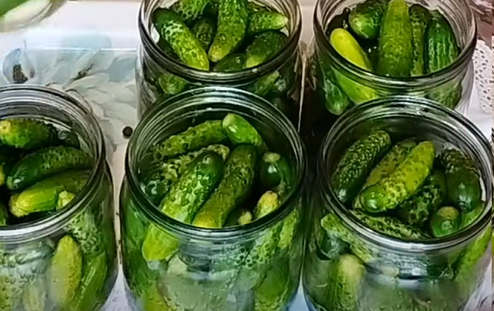 "Все це щільно закладаємо корнішонами. Готову заповнену баночку заливаємо окропом і залишаємо баночки приблизно на 10-12 хвилин.
