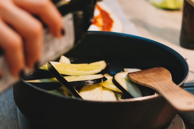 Повертаємося до наших баклажанів: зціджуємо сік, який вони пустили за цей час Можна за бажання промити їх у воді, після чого відправляємо овочі смажитись на сковорідку з обох боків. Після приготування стерилізуємо банки. І далі у вже простерилізовану тару починаємо накладати смажені баклажани.