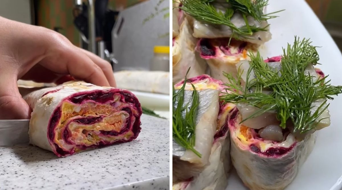 Початок грудня - оптимальний час для складання меню на Новий рік. Все більшою популярністю у кулінарів користуються оновлені рецепти класичних святкових салатів. Раніше ми розповідали, як приготувати олів'є з тунцем, а тепер підібрали рецепт "Шуби" у виглдяді рулету. Готується такий салат у лаваші, тому їсти його дуже зручно.