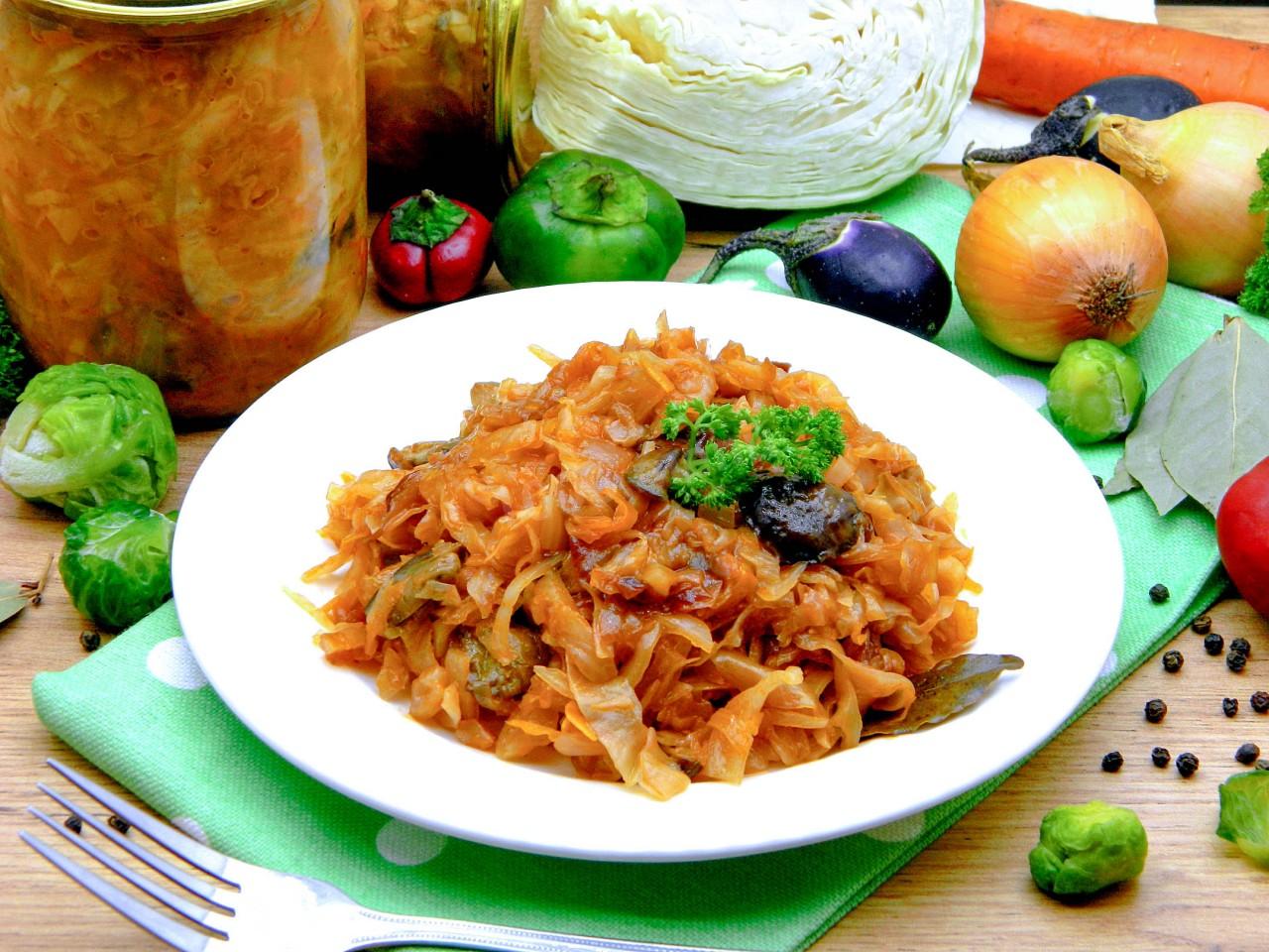 Інгредієнти: 1 кг опеньків або інших грибів, 2 кг капусти, 500 г моркви, 1 кг цибулі, 250 мл олії, 1 ст. ложка томатної пасти, 1,5 ст. ложки солі, 1,5 ч. ложки меленого чорного перцю, 50 мл оцту 9%.
