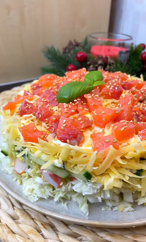 Інгредієнти цього святкового салату - ½ невеликої пекінської капусти, 200 г крабових палички, 3 варені круто яйця, 1 огірок, 150 г твердого сиру і слабосолона червона риба для прикраси. Збирають салат шарами в роз'ємній формі-кільці або салатнику з високими бортами. Кожен шар салату слід трохи змастити майонезом: